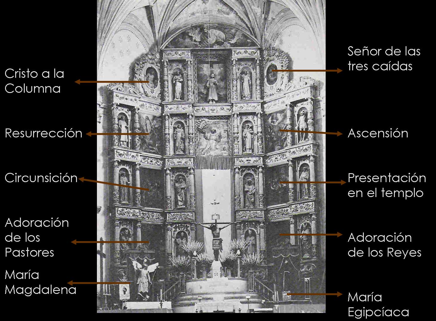 Las partes que podemos apreciar son el banco, donde se apoya todo el retablo, con tres cuerpos y el remate o ático. En verticales tenemos las calles.