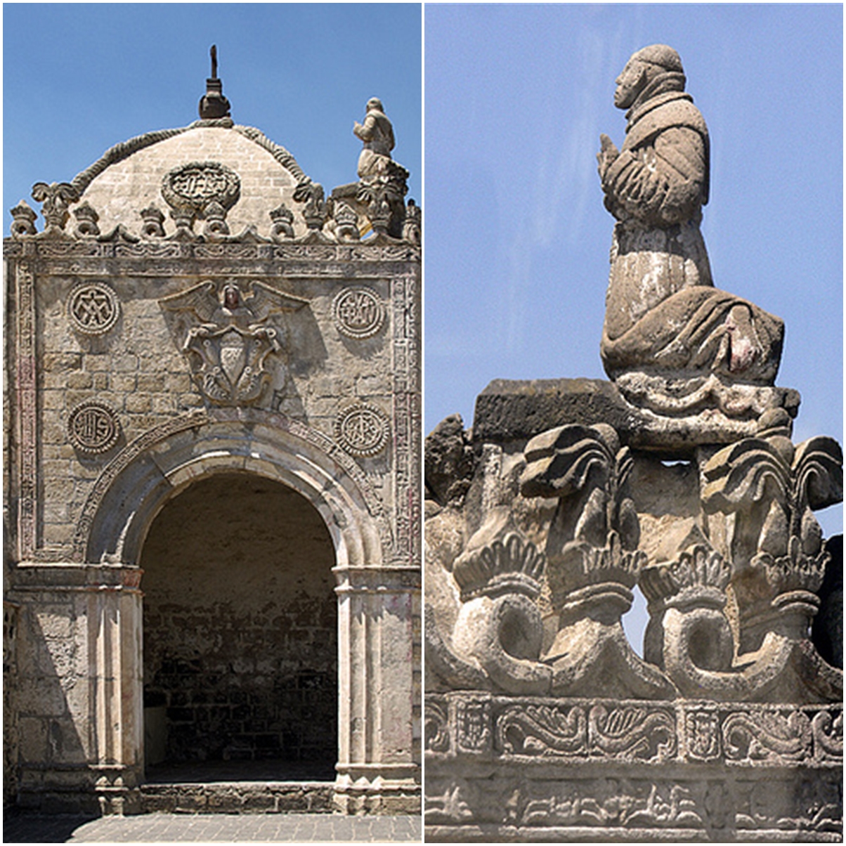 Es también un templete pero rematado de forma diferente lo que nos demuestra que no hay un modelo único. En este caso se remata con una estructura piramidal por aproximación de hiladas. Demuestra que no se han asimilado las formas curvas. Aquí también participarán los indígenas orientados y adoctrinados por los monjes franciscanos. En el interior también podríamos encontrar imágenes pintadas. La cara principal nos muestra un tema iconográfico repetido hasta la saciedad en Europa. Nos referimos a Cristo en el centro en majestad flaqueado por la espada y por la vara florida (igual que el Juicio Final de Miguel Ángel). A la izquierda la Virgen y a la derecha San Juan. A su vez localizamos ángeles trompeteros llamando a los muertos que están saliendo de sus tumbas, resurrección de la carne.