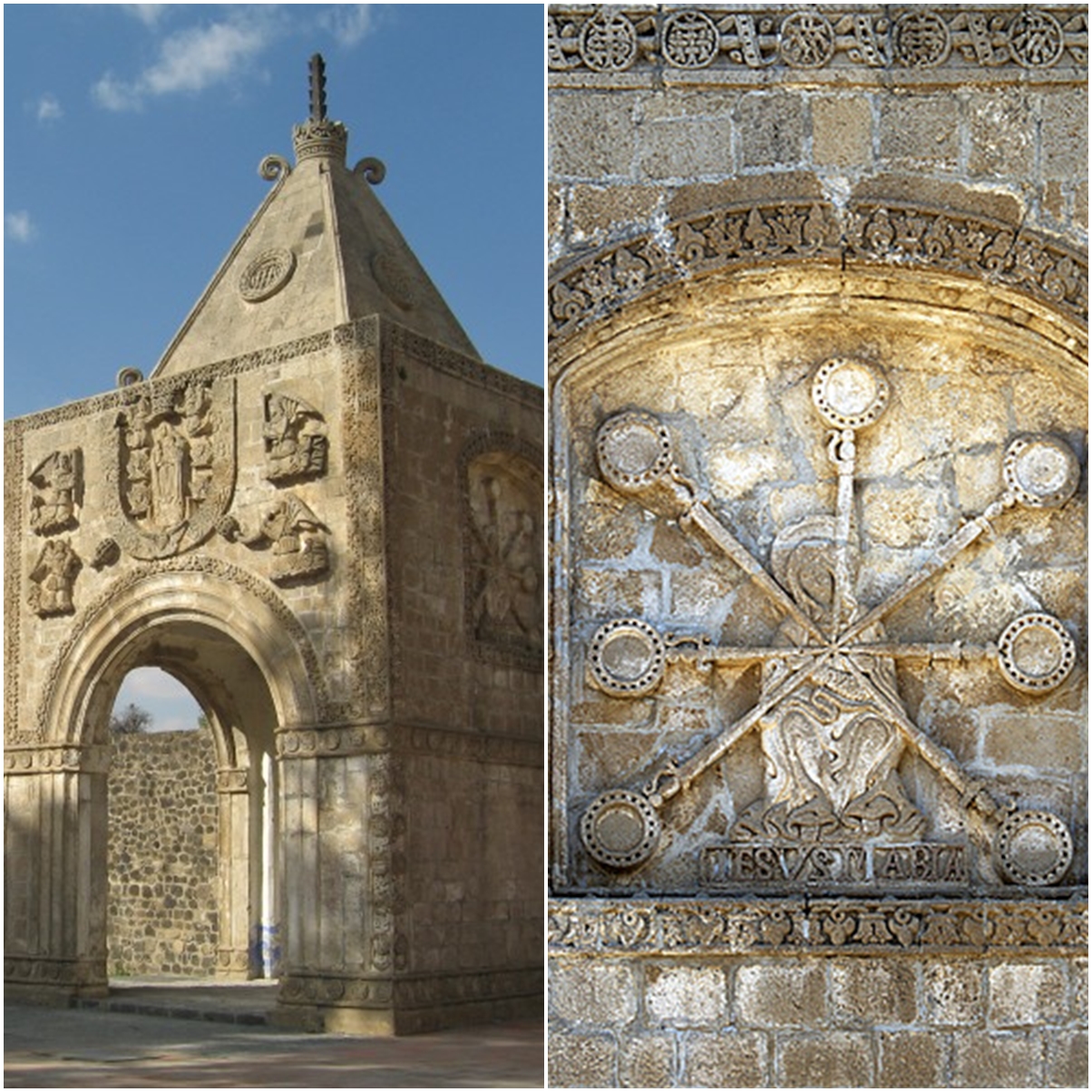 En los soportes a ambos lados de la puerta tienen en el centro unos escudos, uno de ellos tiene las llaves de San Pedro, potestad religiosa, con una cruz y una corona.